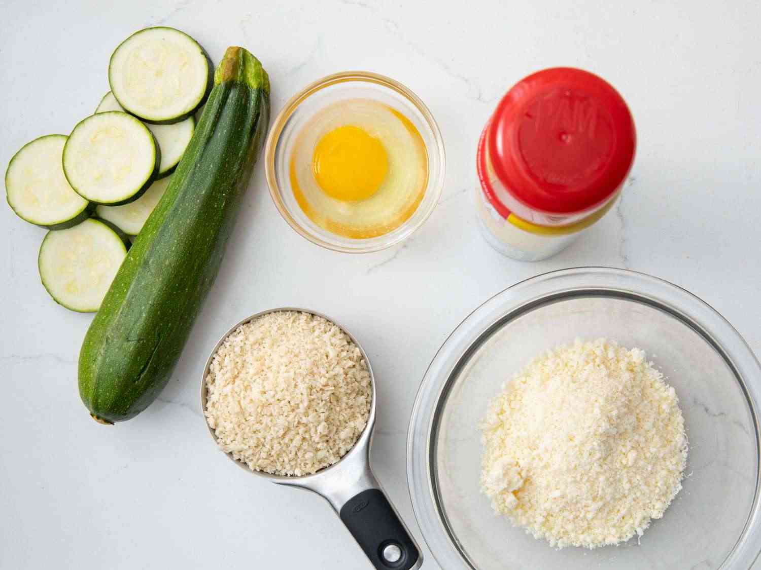 - Step 3:Combine panko and Parmesan cheese on a plate. Dip 1 zucchini slice into beaten egg then into panko mixture, pressing to coat. Place zucchini slice on a wire baking rack and repeat with remaining slices. Lightly spray zucchini slices with cooking spray. Dotdash Meredith Food Studios